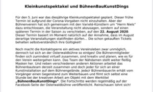 Kleinkunstspektakel an Osterwaldbühne verschoben Zeige grösseres Bild Kleinkunstspektakel an Osterwaldbühne verschoben Quelle Osterwaldbühne Von Christian Goeke|2020-06-23T08:26:12+02:00Mai 24th, 2020|Osterwald, Pressemitteilungen, Salzhemmendorf, Sonstiges, Veranstaltungen, Vereine|0 Kommentare