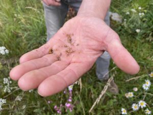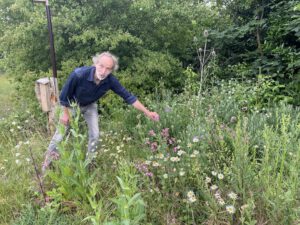 „Es ist toll, dass die Kinder so an die Natur herangeführt werden und im Kindergartenalter schon das Interesse für die Natur geweckt wird. Natürlich gibt es auch mal Konfliktpotential, wenn ein Gelände als ungepflegt empfunden wird“, so Hofer. Mit Hilfe einer Trockensteinmauer, Totholz, Sand oder Nistkästen wurden auf der Wiese auch kleine Sonderlebensräume geschaffen. So darf auch mal ein Nistkasten von den Kindern unter Aufsicht geöffnet und das Vogelnest inspiziert werden. Die verschiedenen heimischen Wildpflanzen wie Johanniskraut, Schwarze Königskerze oder Riesenglockenblume werden von Maschke und seinem Team selber herangezogen, da es Wildpflanzen nur schlecht zu kaufen gibt. Auch wenn die Wiese mit Wildpflanzen ausgefüllt ist, muss das Gelände gepflegt werden. Ein bis zweimal im Jahr wird die Wiese vorzugsweise mit einer Sense gemäht, wo dann auch das gemähte Gras weggeräumt wird. Die Wiese in Osterwald ist mittlerweile zu einem Hotspot der Insektenwelt geworden, wo zahlreiche Insekten bewundert werden können.