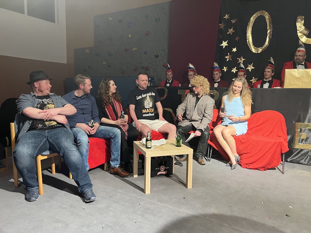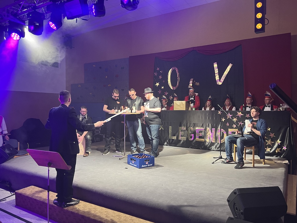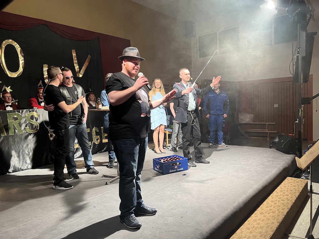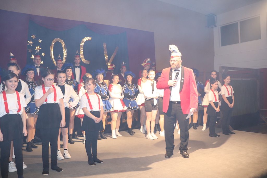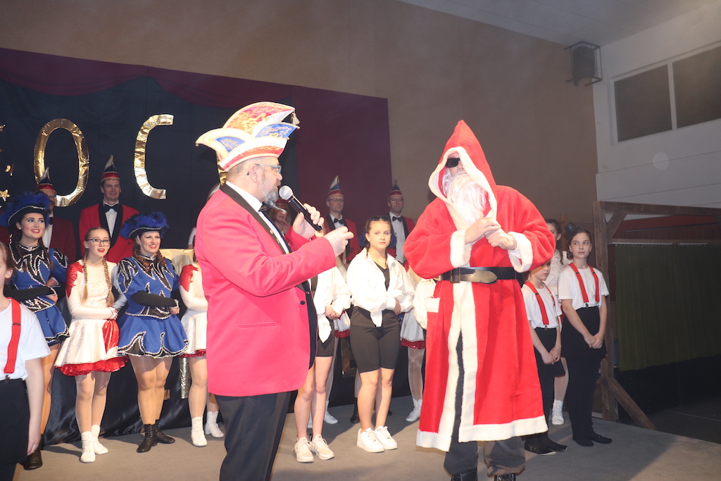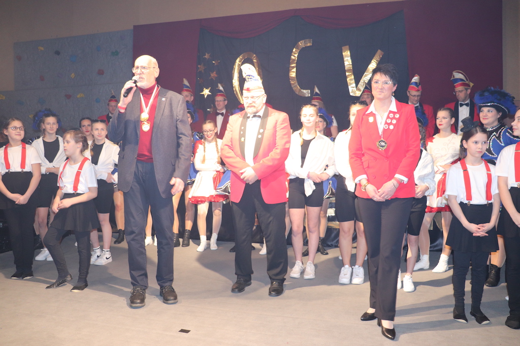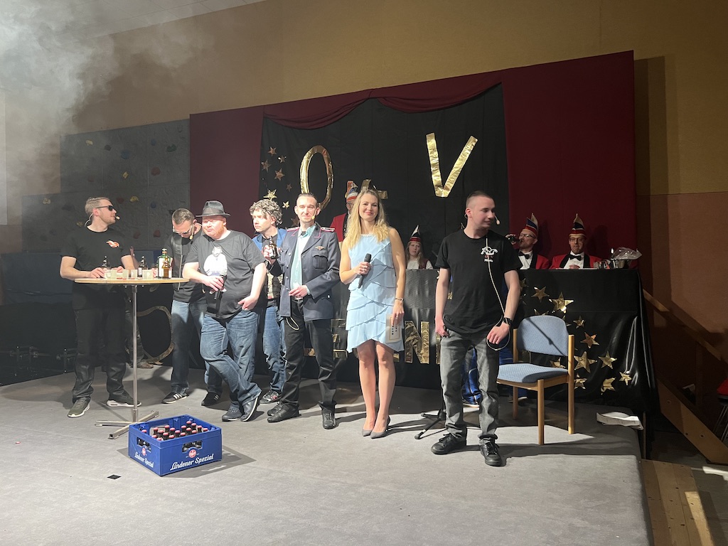 Beim Programm war dieses Jahr auch wieder den OCV-Minis der Start vorbehalten, die im gleißenden Scheinwerferlicht der Bühne eine hervorragende Rolle spielten. Die Minis waren dann auch der passende Anheizer für die Ehrenpräsidentengarde, die Ehrenpräsident Jürgen Spörhase dann auch selber ansagen durfte. Wie das Loch in den Käse gehört zum Karneval aber auch die Büttenrede, die Hampi Dreier wieder selber übernahm und dabei zur Freude der Besucher wieder so manchen aufs Korn nahm. Komödiantischer Höhepunkt des Abends waren aber wieder die Jatibo’s, wo zahlreiche Stars und Legenden auf dem Sofa von Thomas Gottschalk und Michelle Hunziker bei „Wetten Dass“ Platznahmen. Dort wollte Bud Spencer „so manchen Scheitel ziehen“, Terence Hill warb für Maggi, Marianne Rosenberg gehörte wieder zu ihm, die Ehrlich Brothers verzweifelten an der Sägenummer, Werner fand das Schnüffelstück, Mario Basler bewies seine gute Nase beim Alkohol-Tasting und Otto sorgte nicht nur auf der Bühne für gute Laune. Besonders lautstark wurde es aber auch bei den OCV-Kids, als die „peinlichen“, aber stolzen Eltern ihre Anfeuerungsschilder rausholten. Stammgast ist mittlerweile auch Büttenredner Josef Wirth, der natürlich Corona ordentlich auf die Schippe nahm.