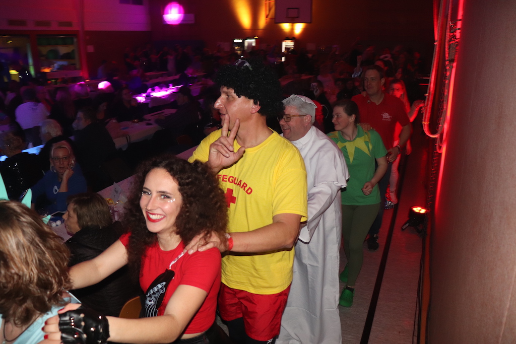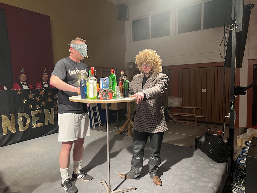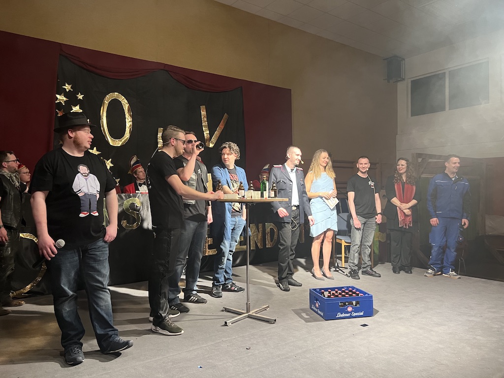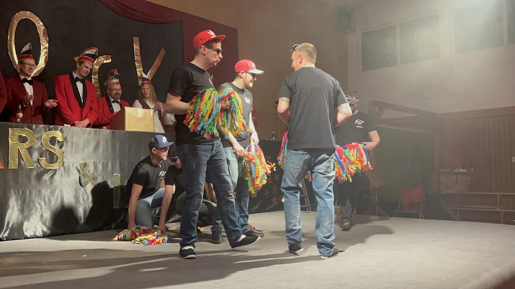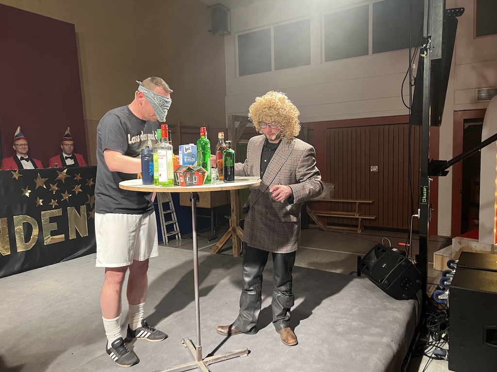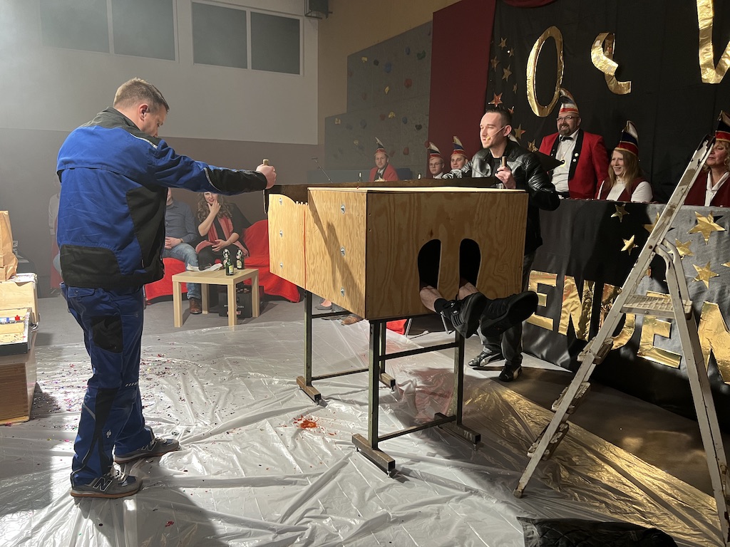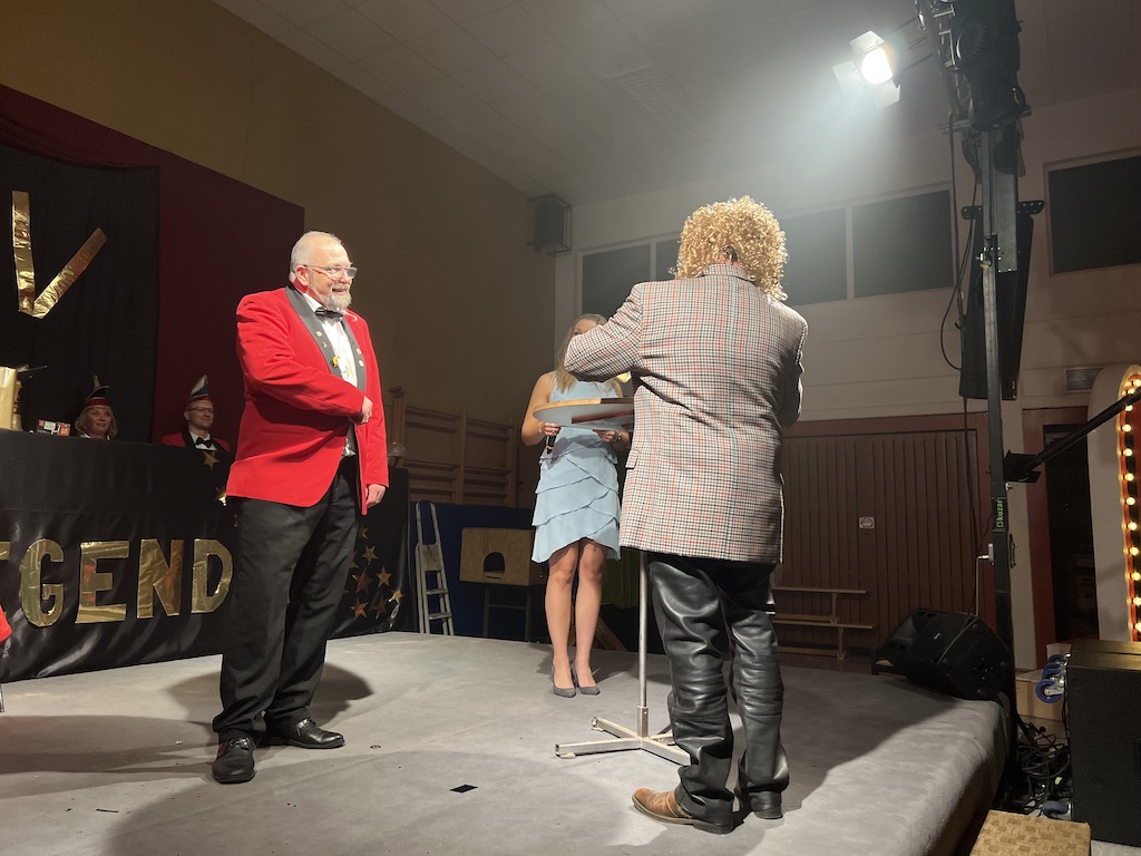Beim Programm war dieses Jahr auch wieder den OCV-Minis der Start vorbehalten, die im gleißenden Scheinwerferlicht der Bühne eine hervorragende Rolle spielten. Die Minis waren dann auch der passende Anheizer für die Ehrenpräsidentengarde, die Ehrenpräsident Jürgen Spörhase dann auch selber ansagen durfte. Wie das Loch in den Käse gehört zum Karneval aber auch die Büttenrede, die Hampi Dreier wieder selber übernahm und dabei zur Freude der Besucher wieder so manchen aufs Korn nahm. Komödiantischer Höhepunkt des Abends waren aber wieder die Jatibo’s, wo zahlreiche Stars und Legenden auf dem Sofa von Thomas Gottschalk und Michelle Hunziker bei „Wetten Dass“ Platznahmen. Dort wollte Bud Spencer „so manchen Scheitel ziehen“, Terence Hill warb für Maggi, Marianne Rosenberg gehörte wieder zu ihm, die Ehrlich Brothers verzweifelten an der Sägenummer, Werner fand das Schnüffelstück, Mario Basler bewies seine gute Nase beim Alkohol-Tasting und Otto sorgte nicht nur auf der Bühne für gute Laune. Besonders lautstark wurde es aber auch bei den OCV-Kids, als die „peinlichen“, aber stolzen Eltern ihre Anfeuerungsschilder rausholten. Stammgast ist mittlerweile auch Büttenredner Josef Wirth, der natürlich Corona ordentlich auf die Schippe nahm.