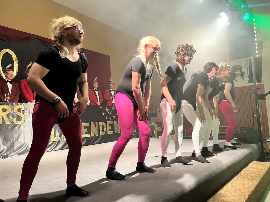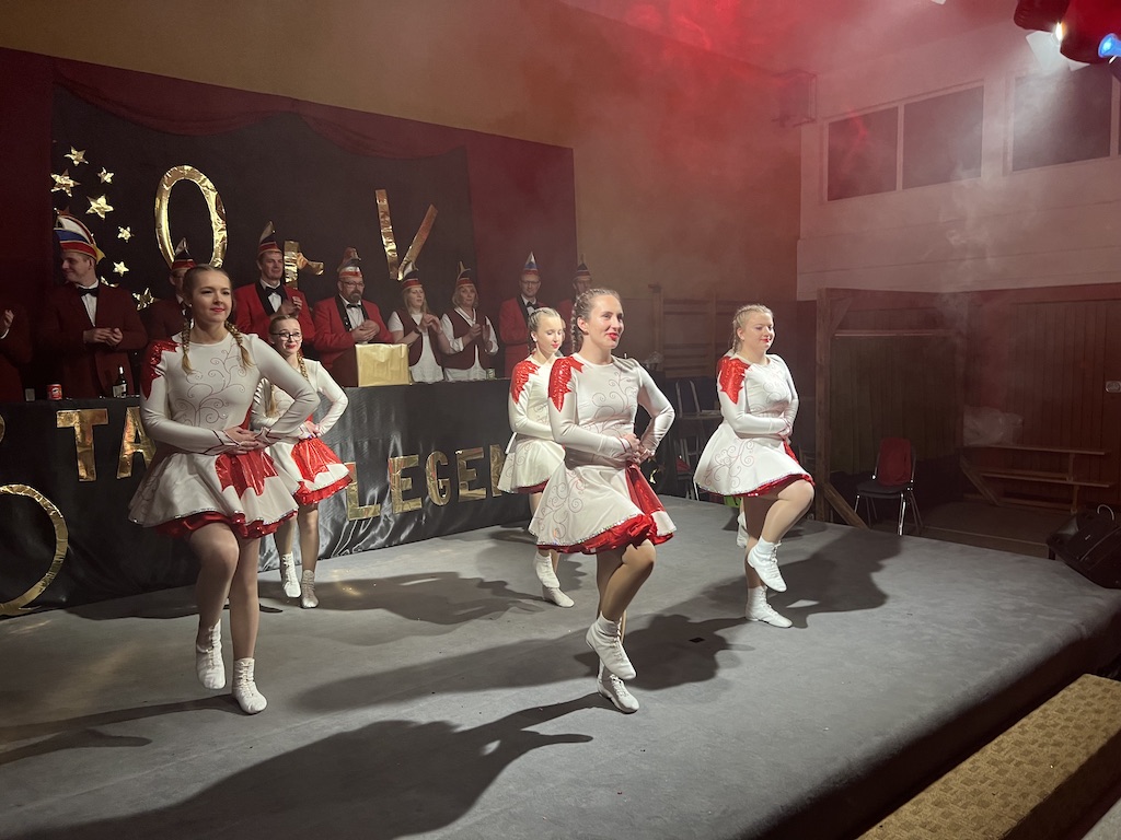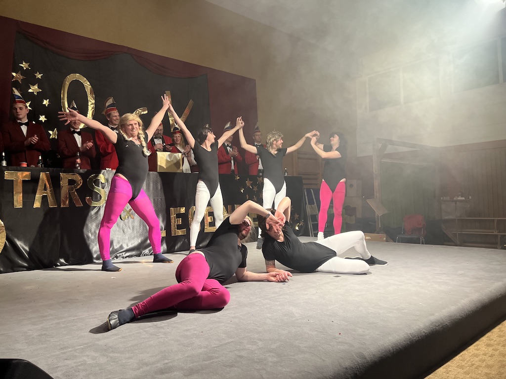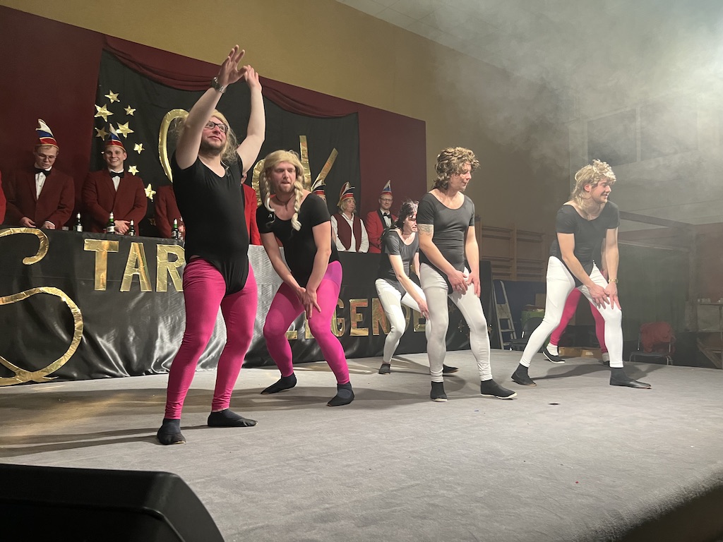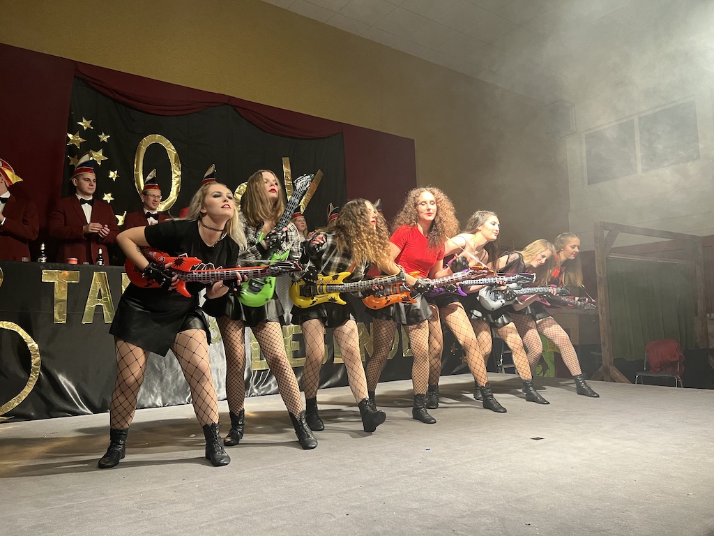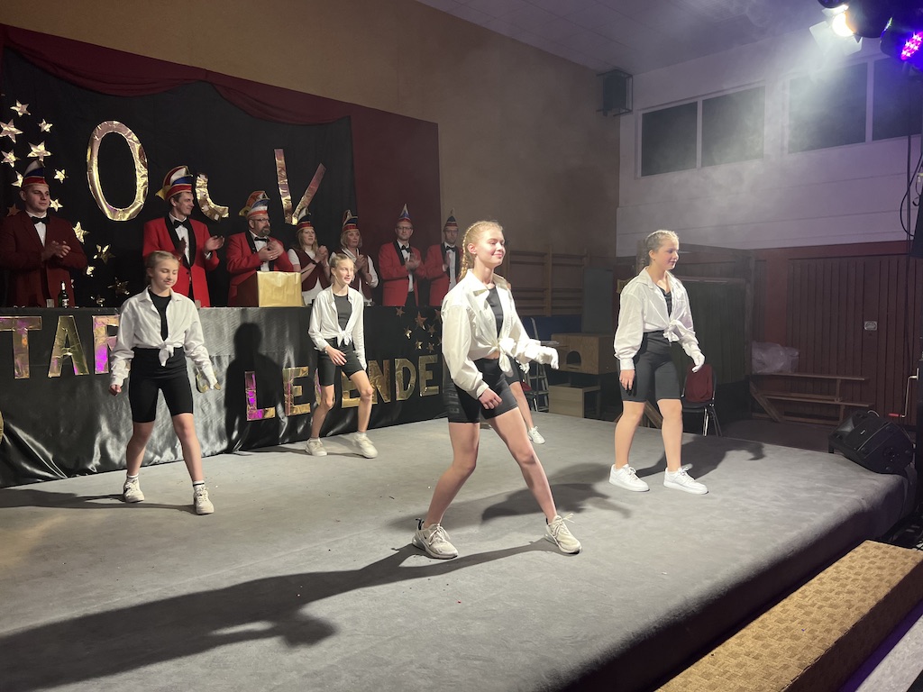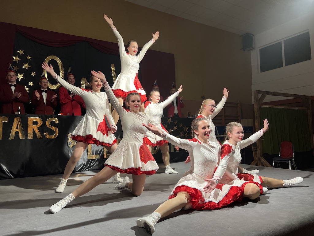 Nichts verlernt in der Pandemie hat die „Garde rot-weiß“, die dort sogar Zuwachs bekommen hat. Unter lautstarkem Jubel zeigte der Gardenachwuchs, dass der OCV für die nächsten Jahre bei den Tanzdarbietungen der Erwachsenen sehr gut aufgestellt sein wird. Direkt nach der abschließenden Pyramide forderten die begeisterten Zuschauer sofort eine Zugabe, die sie natürlich auch bekamen. Im zweiten Teil ihres Auftritts erinnerten die Jatibo’s mit ihrer Hommage an die Rosaroten Panther an längst vergessene Zeiten und wahre Legenden des Ockenser Carnevalvereins. Der Auftritt der Jatibo’s bedeutete aber noch nicht das Ende des Abends. Zum Abschluss sorgte die OCV-Showtanztruppe mit einem Rock-Medley für Jubelstürme in der ganzen Halle. Das OCV-Männerballett und das Finale mit allen Beteiligten auf der Bühne sorgte schließlich für den passenden Abschluss eines unvergesslichen Abends voller Stars und Legenden.