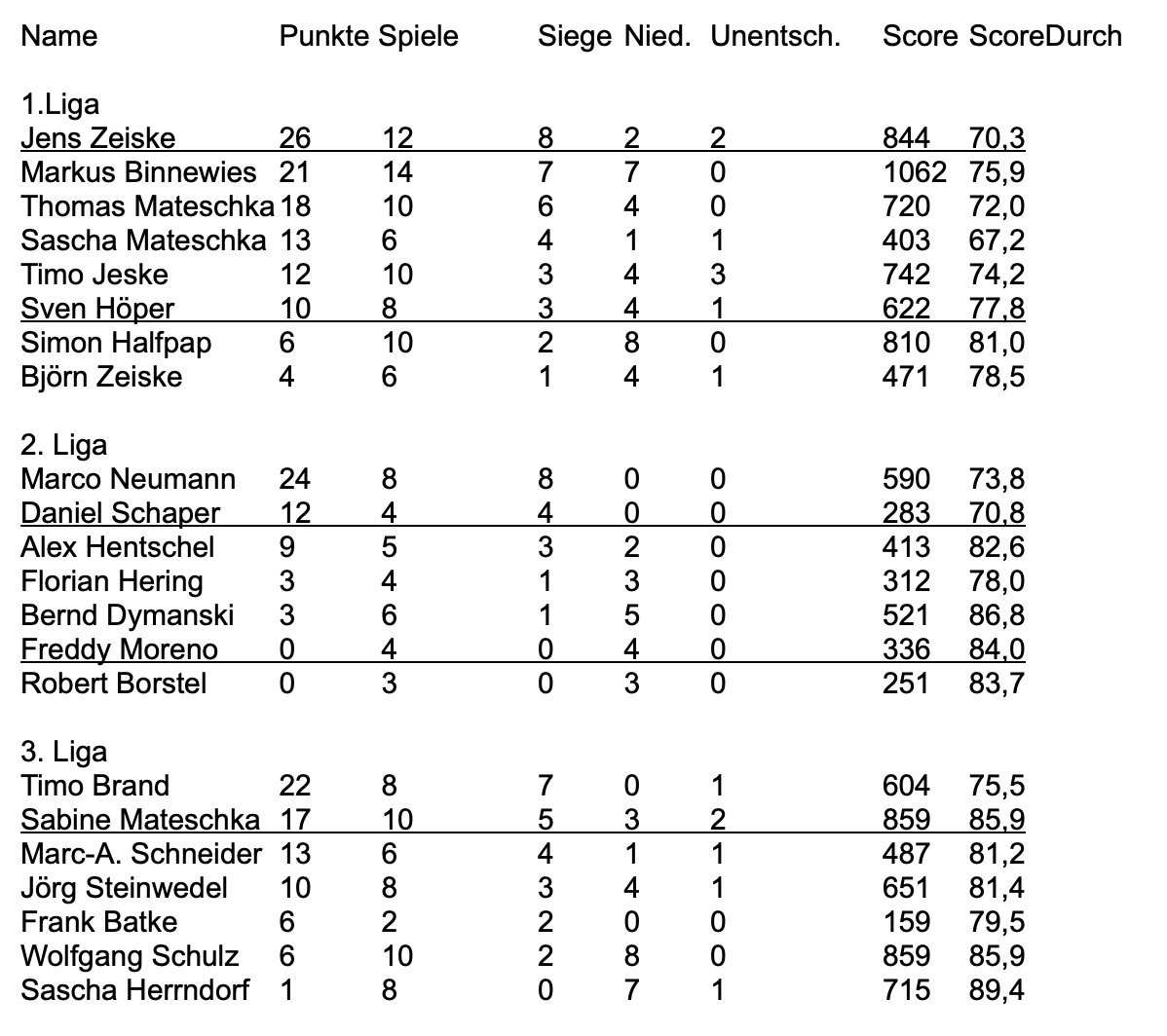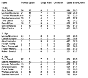 In der ersten Liga gab es nur das Duell zwischen Sven Höper und Markus Binnewies, wo beide wichtige Punkte sammeln konnten. Das erste Spiel gewann Binnewies gegen Höper mit 76:80 und konnte so weiter Druck auf das obere Tabellendrittel ausüben. Allerdings verlor er das zweite Spiel dagegen klar mit 81:71 gegen Höper, der dafür wichtige Punkte im Abstiegskampf sammelte. Während Höper in noch zwei Duellen punkten könnte, ist die Saison für Binnewies aber schon zu Ende. Der Föhrster kann sich jetzt zurücklehnen und gucken, wie die anderen Spieler mit dem Druck umgehen.