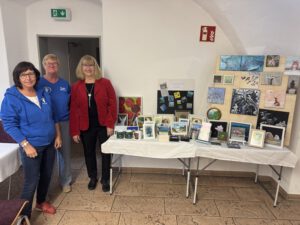 Ein besonderes Highlight in diesem Jahr ist das Gemeinschaftsprojekt: originelle, handbemalte Brillenetuis, die bei den Besuchern für Aufsehen sorgten. Zudem konnten kleine, ausgesuchte Bilder erworben werden. Wie schon in den Vorjahren ging der Erlös der Verkäufe sowie der Einnahmen aus der Kaffeetafel an den Kinderschutzbund Gronau. Ganz ohne Herausforderungen war die Vorbereitung der Ausstellung nicht. Da der Keller erst einen Tag vor Beginn der Ausstellung zur Verfügung stand, mussten die Montagsmalerinnen unter Zeitdruck aufbauen. Mittlerweile erleichtern aber einige Schienen das Anbringen der Bilder an den alten Mauern des Gewölbes – eine Aufgabe, die in den Anfangsjahren noch deutlich schwieriger war.