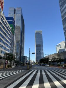 Mit unserem Frühstück im Gepäck sind wir dann in den Stadtteil Tokio gefahren. Bevor die erste richtige Aktivität für den Urlaub anstand, hatten wir noch ein bisschen Zeit. Daher sind wir ein bisschen durch die Gegend gelaufen, haben unsere 7-eleven Sachen gegessen und uns dann in einen Starbucks in einem Hochhaus gesetzt und ein Getränk bei der Aussicht genossen. Weil es so früh war, war auf den Straßen auch im Prinzip gar nichts los. Dadurch wirkte das Ganze ziemlich surreal. Große moderne Gebäude und verlassene Straßen. Um 09.30 Uhr haben wir uns dann vor dem Aufzug des Eingangs zum Pokemon Center angestellt.