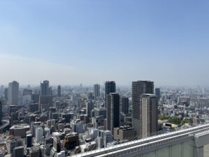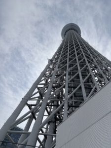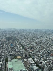 Mit der Bahn ging es dann zu unserem ersten richtigen Stop des Tages. Um 10 Uhr hatten wir Tickets gebucht für den „Tokyo Skytree“. Die Tickets konnte man über die offizielle Website kaufen. Mit dem generierten QR-Code konnte man dann mit der Fast-Lane am Ticketschalter richtige Tickets ziehen. Insgesamt ist das Ganze unglaublich organisiert gewesen, das gilt jedoch für so ziemlich alles in Japan. Wir haben uns nur für die untere der beiden Plattformen entschieden, da es noch zu anderen Aussichtsplattformen gehen sollte. Man hat eine tolle Sicht von oben und durch abgeschrägte Fenster konnten man auch super unter sich gucken. Der einzige Nachteil war die Masse an Menschen, sodass man oft warten musste, um ans Fenster zu gelangen.