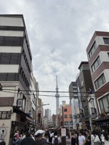 Nachdem wir vor Ort genug Geld gelassen haben, sind wir weiter ins Asakusa-Viertel. Selbstverständlich konnten wir nicht am Asakusa-Schrein vorbei gehen. Als erstes habe ich mir eine Vorhersage geben lassen. Dazu hat man vor Ort ein Stäbchen aus einem Kasten gezogen. Die Zahl darauf wurde einem Zettel zugeordnet und man hatte eine Art großen Glückskeks. Im Folgenden haben wir uns die Gebäude und den Tempel angeschaut. Nach einer kleinen Stärkung bestehend aus Erdbeer-Rote-Bohnen-Paste-Mochi und einer kleinen Portion Bratnudeln ging es weiter auf die Nakamise Straße. Dort gibt es viele kleine Läden, in denen man allerlei Souvenirs kaufen konnte. Zum Schlendern war die Straße jedoch schlichtweg zu voll, was vielleicht auch an dem Nationalfeiertag lag. Daher sind wir in Nebenstraßen abgebogen, die nicht nur viel ruhiger, sondern auch viel schöner waren.