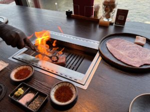 Kulinarisch sollte unser Tag mit einem typischen Gericht Japans enden: Wagyu-Beef. Unsere Wahl fiel dabei auf das „Wagyu Yakiniku Panga Asakusa“. Wir wurden an einen Tisch mit direkter Aussicht aus Wasser und den Skytree gesetzt. Der Platz war ein Traum und besonders praktisch war der Verstauraum unter unseren Sitzbänken. Wir haben uns für ein Wagyu-Probierpaket und ein zusätzliches Steak entschieden. Das Steak wurde auf dem Grill vor uns für uns zubereitet, sodass es perfekt gebraten wurde. Den Rest konnten wir dann selber auf unserem kleinen Tischgrill zubereiten. Dazu gäbe es Salz, Pfeffer, Wasabi und eine dunkle Soße zum dippen. Die Qualität war unglaublich und geschmacklich war es auch sehr gut. Insbesondere das Ribeye war gut, wobei das Fleisch insgesamt sehr fettig war. Es gab Stücke, die aufgrund des Fettes fast ausschließlich weiß waren. Auch wenn dieser Fettdurchzug charakteristisch für Wagyu ist, gefällt uns mageres Rind, wie man es in Deutschland erhält bedeutend besser. Für japanische Verhältnisse war es doch ein teuereres Essen, für unsere Preise war es jedoch günstig. Ich würde es nicht unbedingt wiederholen wollen, aber wenn man in Japan ist, sollte man Wagyu definitiv mal probieren.