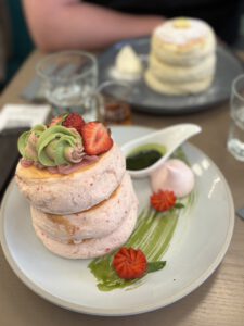 Zum Frühstück sollte es mal wieder etwas landestypisches geben. Daher entschieden wir uns für Japanese Soufflee Pancakes bei „Micasadeco & Cafe Jingumae“. Da es ein sehr beliebter Laden mit nur wenigen Plätzen war, mussten wir jedoch eine gute halbe Stunde warten, die jedoch recht schnell rumging. Wir wählten dann Ricotta-Butter-Pancakes mit Ahorn-Sirup und Erdbeer-Matcha-Pancakes mit Erdbeeren und Erdbeersahne. Die Pancakes waren lecker, aber nicht wirklich besonderer als normale Pancakes. Wer gerne süß frühstückt, der sollte diese typischen Pancakes auf jeden Fall mal ausprobieren.