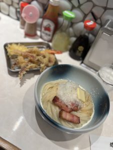 Direkt danach haben wir uns quasi um unser Mittagessen gekümmert. Wir wollten zu „Menchirashi“ um die berühmten Carbonara Udon auszuprobieren. Dadurch, dass diese so berühmt sind, hat der Laden enorme Wartezeiten. Allerdings geht man hin und zieht sozusagen eine elektronische Wartenummer. Dann bekommt man einen Link und damit kann man auf der Website sehen, wann man sich in die physische Schlange anstehen kann, die nochmal ca. 30 Minuten dauert. Wir hatten etwa eine elektronische Wartezeit von zwei Stunden.