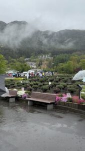 Etwa 40 Minuten später erreichten wir dann den Kawaguchiko Oishi Park mit dem Lake Kawaguchiko. Auch hier konnten wir Fuji nicht sehen. Allerdings bot der Park mit dem See und den niedrigeren Bergen im Hintergrund auch so einen schönen Anblick.