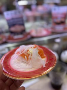 Da wir ein wenig Hunger hatten, entschieden wir uns dafür, zu „KURA Sushi“ zu gehen. Eine berühmte Laufbandsushikette. Man muss an einem Automaten Daten auswählen, wie mit wie vielen Personen man da ist und wo man gerne sitzen möchte. Dann erhält man eine Nummer und man wartet bis diese aufgerufen wird. Bei uns wurde eine Wartezeit von 1,5h angegeben. Allerdings wurden einige Nummern gestrichen, da die Personen nicht auftauchten. Daher waren wir nach ca. 30 Minuten schon dran. Alles, was dann kam, war eine große Enttäuschung. Es gab kein Behältnis für die Sojasoße, keinen Becher für den Tee und insgesamt war der Tisch schlecht ausgestattet und dreckig. Das Sushi war mit das schlechteste, was ich bisher hatte. Wir hatten vielleicht acht Nigiri und dann sind wir abgehauen. Der einzige Pluspunkt bestand darin, dass es super günstig war.