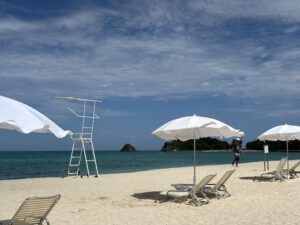 Im Anschluss ging es dann direkt an den Strand für uns. Handtücher gab es so viele wie man wollte vor Ort. Gefühlt war auch gar nichts los, sodass wir freie Wahl bei den Liegen hatten. Im Wasser selbst gab es super viele Korallen und es war eine schöne Abkühlung. Ganz so blau wie das „Hawaii Japans“ wie es angepriesen wurde war es dann doch nicht, aber es konnte sich definitiv sehen lassen.