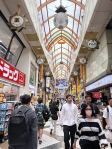 Da der letzte Tag ziemlich vollgepackt war und mich die typische Klimaanlagen-Erkältung ein wenig niederstreckte, schliefen wir zunächst ordentlich aus. Weil wir bisher auch schon einiges gesehen hatten und den Tag ruhiger angehen lassen wollten, strichen wir die ersten beiden Punkte, die für den Tag geplant waren. Stattdessen gingen wir direkt zum Kuromon Ichiba Market. Dabei ließen wir zum ersten Mal unsere Rucksäcke im Hotel und sind nur mit Bauchtasche los, was ein freies und tolles Gefühl war.
