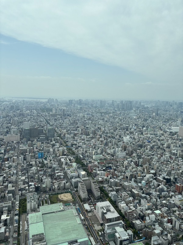 Mit der Bahn ging es dann zu unserem ersten richtigen Stop des Tages. Um 10 Uhr hatten wir Tickets gebucht für den „Tokyo Skytree“. Die Tickets konnte man über die offizielle Website kaufen. Mit dem generierten QR-Code konnte man dann mit der Fast-Lane am Ticketschalter richtige Tickets ziehen. Insgesamt ist das Ganze unglaublich organisiert gewesen, das gilt jedoch für so ziemlich alles in Japan. Wir haben uns nur für die untere der beiden Plattformen entschieden, da es noch zu anderen Aussichtsplattformen gehen sollte. Man hat eine tolle Sicht von oben und durch abgeschrägte Fenster konnten man auch super unter sich gucken. Der einzige Nachteil war die Masse an Menschen, sodass man oft warten musste, um ans Fenster zu gelangen.