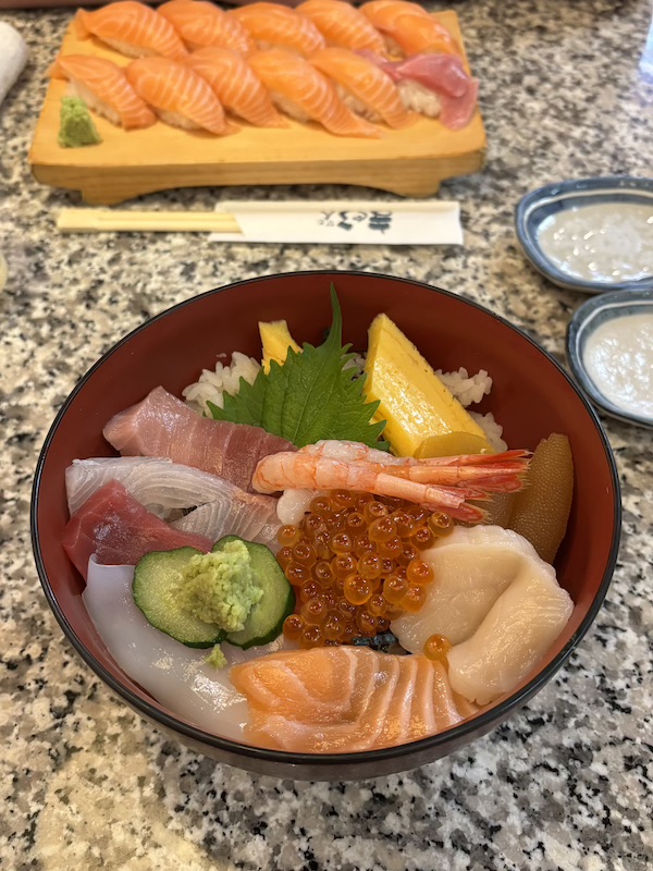 Zum Mittagessen ging es dann wieder zu „Magurobito Shin-Nakamise Street Branch“, den Sushi-Laden, den wir dort schon das erste Mal so unglaublich lecker fanden. Für uns gab es wieder eine Sushi-Bowl und Nigiris und der Preis war auch völlig in Ordnung. Der Laden ist daher eine absolute Empfehlung.