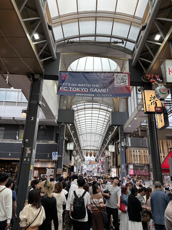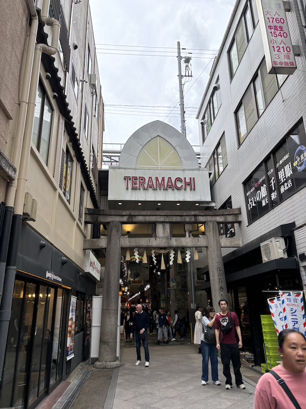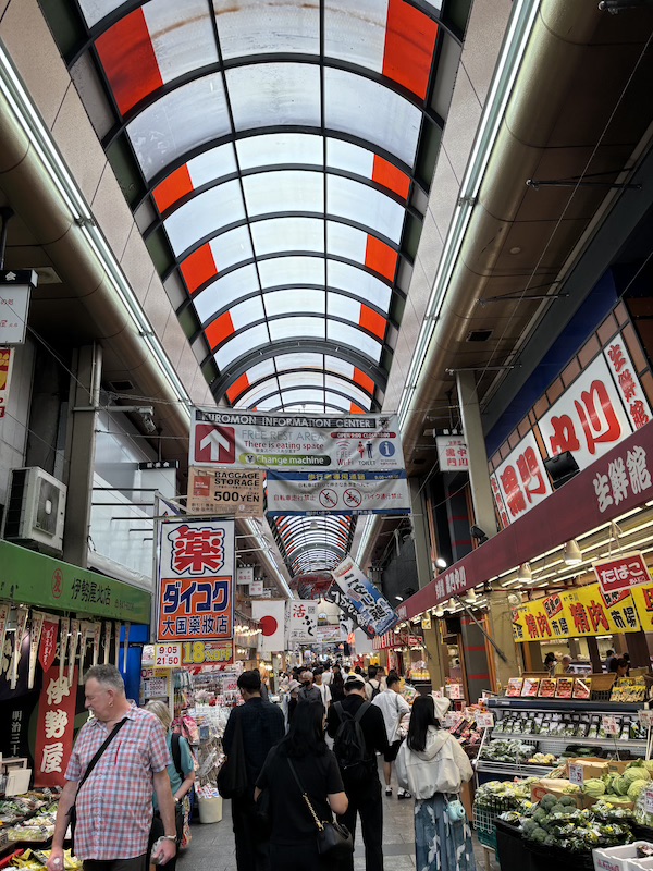 Da der letzte Tag ziemlich vollgepackt war und mich die typische Klimaanlagen-Erkältung ein wenig niederstreckte, schliefen wir zunächst ordentlich aus. Weil wir bisher auch schon einiges gesehen hatten und den Tag ruhiger angehen lassen wollten, strichen wir die ersten beiden Punkte, die für den Tag geplant waren. Stattdessen gingen wir direkt zum Kuromon Ichiba Market. Dabei ließen wir zum ersten Mal unsere Rucksäcke im Hotel und sind nur mit Bauchtasche los, was ein freies und tolles Gefühl war.