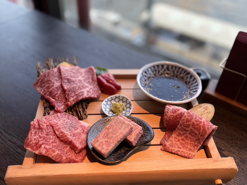 Kulinarisch sollte unser Tag mit einem typischen Gericht Japans enden: Wagyu-Beef. Unsere Wahl fiel dabei auf das „Wagyu Yakiniku Panga Asakusa“. Wir wurden an einen Tisch mit direkter Aussicht aus Wasser und den Skytree gesetzt. Der Platz war ein Traum und besonders praktisch war der Verstauraum unter unseren Sitzbänken. Wir haben uns für ein Wagyu-Probierpaket und ein zusätzliches Steak entschieden. Das Steak wurde auf dem Grill vor uns für uns zubereitet, sodass es perfekt gebraten wurde. Den Rest konnten wir dann selber auf unserem kleinen Tischgrill zubereiten. Dazu gäbe es Salz, Pfeffer, Wasabi und eine dunkle Soße zum dippen. Die Qualität war unglaublich und geschmacklich war es auch sehr gut. Insbesondere das Ribeye war gut, wobei das Fleisch insgesamt sehr fettig war. Es gab Stücke, die aufgrund des Fettes fast ausschließlich weiß waren. Auch wenn dieser Fettdurchzug charakteristisch für Wagyu ist, gefällt uns mageres Rind, wie man es in Deutschland erhält bedeutend besser. Für japanische Verhältnisse war es doch ein teuereres Essen, für unsere Preise war es jedoch günstig. Ich würde es nicht unbedingt wiederholen wollen, aber wenn man in Japan ist, sollte man Wagyu definitiv mal probieren.