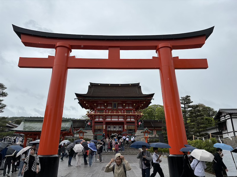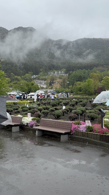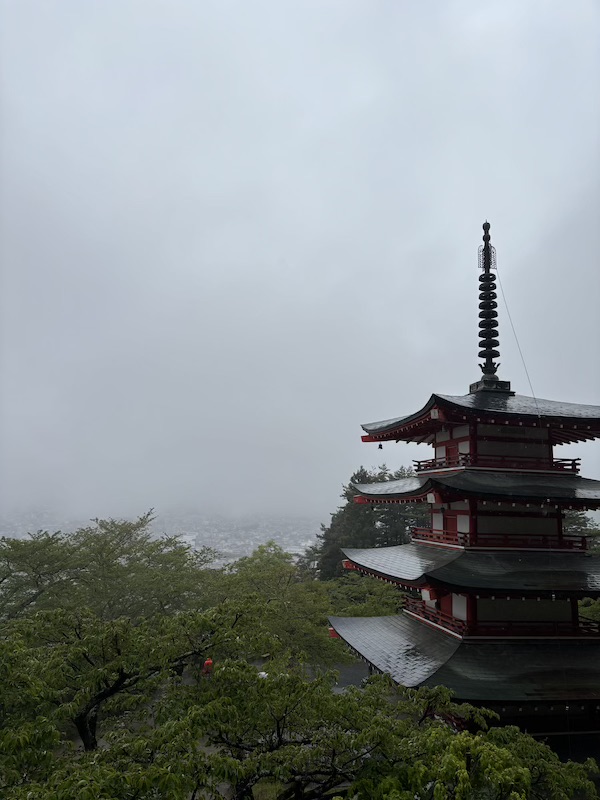 Über den Hikawa Clock Store, ein berühmter Fotospot in einer Straße mit Blick auf den Mount Fuji, der ja nicht zu sehen war, ging es zu meiner persönlichen Hauptattraktion des Tages: der Arakura Sengen Park mit der Chureito-Pagode. Da es mittlerweile noch mehr regnete und wir gänzlich durchnässt waren, überlegten wir erst nicht auf den Berg zu wandern und wie viele andere unserer Reisegruppe im Bus zu bleiben. Uns wurde aber schnell klar, dass wir es bereuen würden, es nicht zu machen.