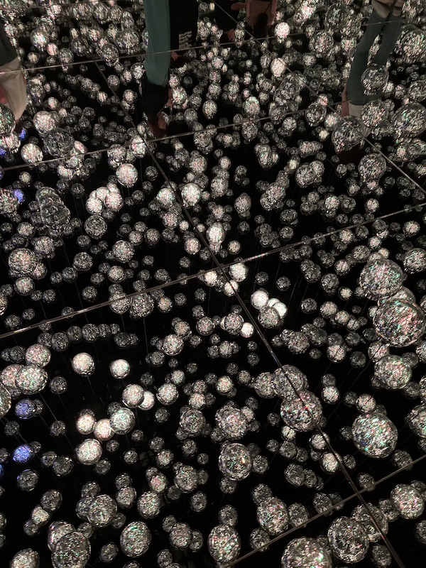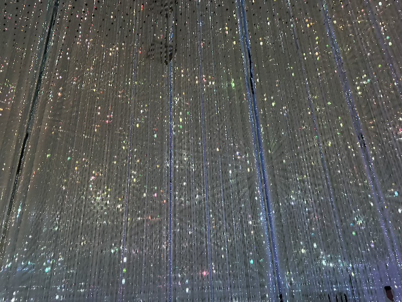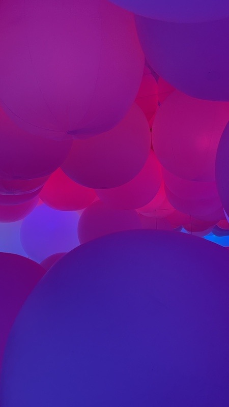 Bevor man in die Wasserwelt darf, schließt man seine Taschen sowie Socken und Schuhe in ein Schließfach ein und desinfiziert die Füße. Dann schlendert man von Raum zu Raum. Es gibt eine weiche Welt, eine Lichter-Spiegel Welt, eine Wasser Welt mit Koi-Fischen und Wasserwegen sowie eine Bälle Welt. Es war alles sehr interaktiv und hat viel Spaß gemacht. Im Planetarium, wo Blumen wir Planeten projiziert wurden, konnte man sich auf den Boden legen und in eine andere Welt abtauchen.