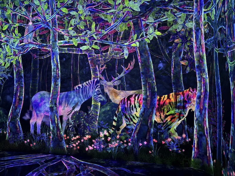 Neben der Wasserwelt gab es auch noch den Wald, die Blumenwelt und den Outdoor Bereich. Insbesondere der Wald war etwas für die kleineren Gäste. Es gab viele Spiele, wie balancieren auf leuchtenden Steinen, klettern, hüpfen und rutschen. Man konnte auch einen Fisch gestalteten, der an die Wände projiziert wurde. Mit einer Handy-App konnte man auf die Suche nach Tieren gehen und diese sammeln.