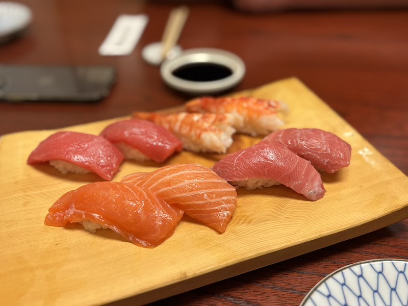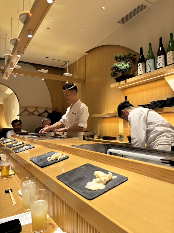 Im Anschluss war eins meiner kulinarischen vermeintlichen Highlights geplant: Omakase. Eine mehrgängiges Sushi-Menü, bei dem man beim Koch an der Theke sitzt und das frisch serviert bekommt, was gerade saisonal und verfügbar ist. Es wurden verschiedenste Sachen serviert, wie Sushi, Suppen, Meeresfrüchte, Omelette sowie Obst. Es gab durchaus Dinge, die fantastisch geschmeckt haben, aber ein Großteil war leider nicht gut. Auch das Erlebnis an sich war enttäuschend. Man saß eingepfercht auf kleinstem Raum und es wurde kaum was zu den servierten Speisen erklärt, auch eine angepriesene lustige Show gab es nicht. Dazu kam noch der Preis, der ziemlich hoch war.