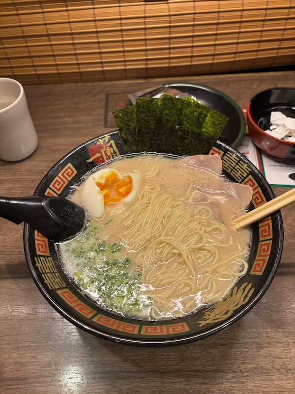 Daher wurde unser erster Stop des Tages Asakusa, weil das eines unserer Lieblings-Viertel war. Wir wollten den Tag unbedingt nochmal zu Ichiran, aber weil es irgendwie nicht so in die Tagesplanung gepasst hat, dachten wir, wir gehen direkt zum Frühstück hin. Gesagt getan. Eigentlich sollte die Filiale erst um 10 Uhr öffnen. Wir waren aber schon um 9.40 Uhr dort und konnten direkt rein und bestellen. In dieser Filiale gab es auch ganz normale Restaurant-Stühle und nicht nur diese typischen Plätze an der „Bar“. Daher setzten wir uns diesmal an so einen Tisch. Da wir ja bereits einige Mal dort waren, hatte ich auch meine perfekte Kombination gefunden und war richtig glücklich. Es war tatsächlich auch gut, dass wir bereits so früh da waren, da der Laden um 10 Uhr bereits voll war und sich eine Schlange gebildet hatte. Ein besonderer Hingucker ist auch immer die Toilette mit den tausend Klopapierrollen. Es hat wie auch zuvor fantastisch geschmeckt und das Gericht ist eines der wenigen, was ich am meisten vermisse. Daher haben wir uns dann auch ein Kit für zuhause mitgenommen, was wir uns noch für einen besonderen Moment aufbewahren.
