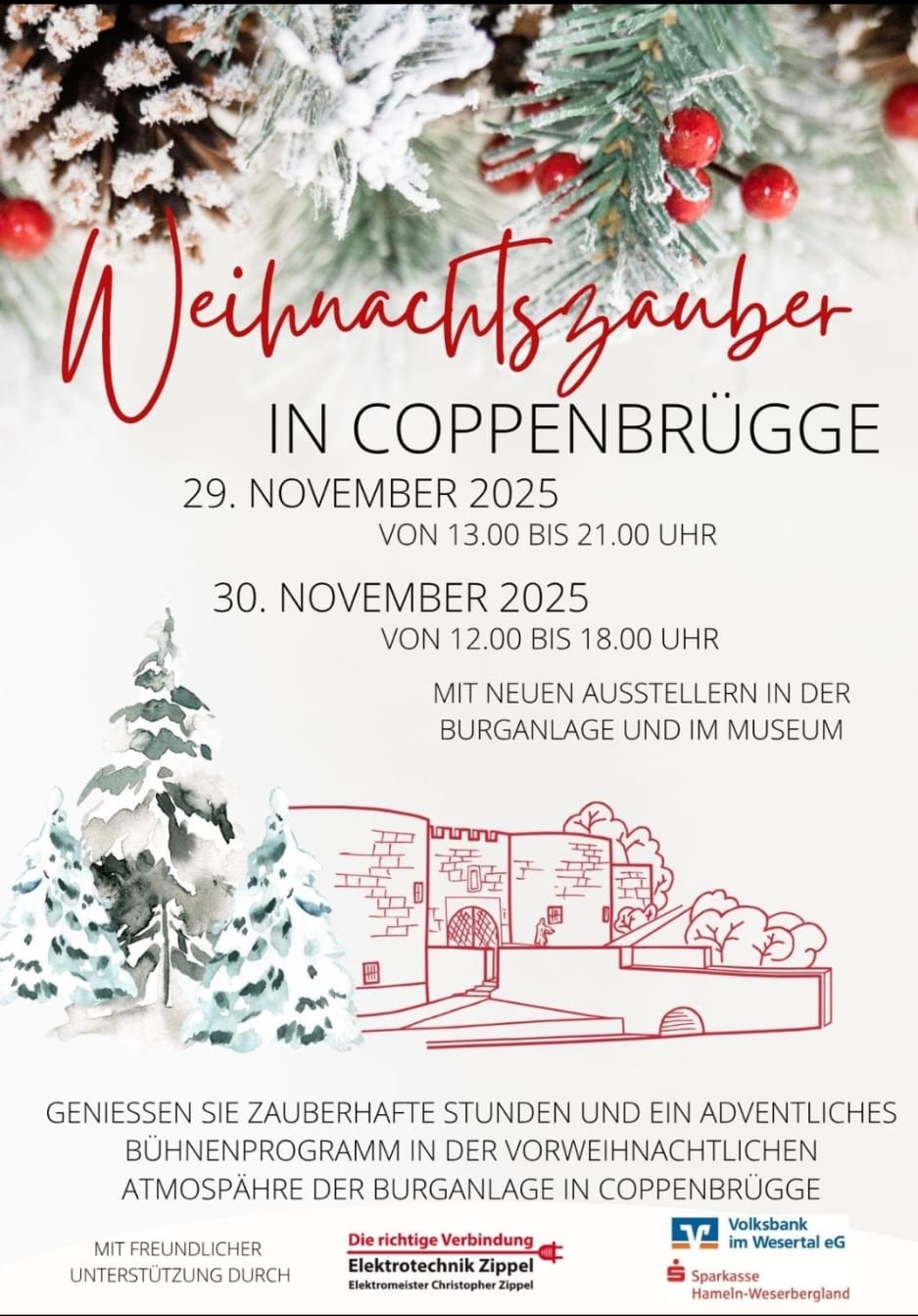 Coppenbrügge (gök). Wenn sich der Innenhof der altehrwürdigen Burg mit Lichtern, Düften und adventlicher Musik füllt, ist es wieder soweit – der Weihnachtszauber in Coppenbrügge steht wieder vor der Tür. Am Samstag, den 29. November von 13 bis 21 Uhr sowie am Sonntag, den 30. November von 12 bis 18 Uhr verwandelt sich die Burganlage erneut in einen der beliebtesten Weihnachtsmärkte der Region. Seit Jahren zieht der Markt nicht nur Besucher aus dem Flecken Coppenbrügge selbst an, sondern längst auch viele Gäste aus dem Umland. Das Ambiente im historischen Burginnenhof sorgt dabei seit jeher für eine einzigartige Atmosphäre. Zwischen Mauern aus mittelalterlicher Zeit reihen sich liebevoll geschmückte Verkaufsstände aneinander. Neben hochwertigem Kunsthandwerk erwarten die Besucher viele kulinarische Köstlichkeiten, von herzhaften Snacks bis zu süßen Leckereien. Das Burgmuseum öffnet an beiden Tagen seine Türen und ergänzt den Weihnachtsmarkt um eine kulturelle Komponente.