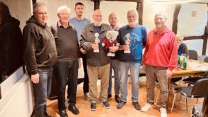 Deutlich spannender verlief das Knobelturnier mit zehn Teilnehmern. Nach 40 Runden standen gleich zwei Spieler mit jeweils 730 Punkten an der Spitze, ein Entscheidungswurf musste her. Mit einer geworfenen Sechs holte sich Hans-Michael Roloff den Pokal vor Ingo Borrmann, dessen Würfel nur eine Vier zeigte. Dritter wurde Ulrich Hiller mit 710 Punkten. Dass es bei den Knoblern äußerst eng zuging, zeigte auch der Kampf um Platz vier. Drei Spieler erreichten hier jeweils 702 Punkte. Das glücklichere Händchen hatte schließlich Klaus-Günter „Foxi“ Roloff, der mit einer Sechs den vierten Rang vor Wilfried Batke und Hartmut Specht behauptete. Ganz leer ging jedoch niemand aus: Die Organisatoren Günter Stichweh und Friedhelm Roloff hatten wie gewohnt für jeden Teilnehmer einen Preis vorbereitet.