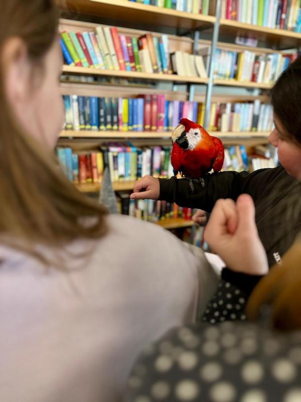 Doch damit war der Vorlesetag noch lange nicht vorbei. Frau Jovita Wehrhahn, Inhaberin der Logopädie-Praxis „Deine Logopraxis“ (https://www.deinelogopraxis.de/), brachte eine ganz besondere Lesebegleitung mit: ihren Ara, Schrägeus! Während sie den Kindern liebevoll aus einem Buch vorlas, saß der bunte Vogel auf ihrem Arm. Und das Highlight: Einige mutige Schüler:innen durften den Ara selbst auf den Arm nehmen, ihn streicheln und seine weichen Federn fühlen. Die Kinder waren sichtlich ergriffen – so ein lebendes, sprechendes Tier beim Vorlesen war für sie ein unvergesslicher Moment.