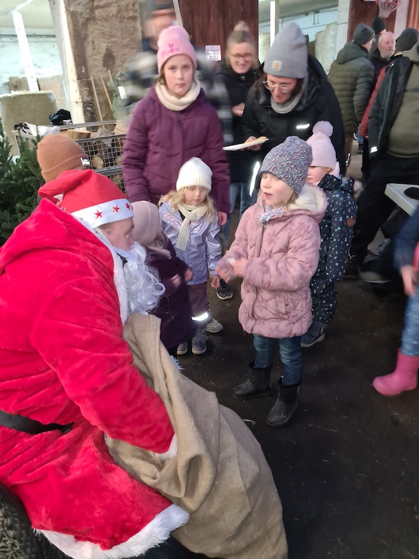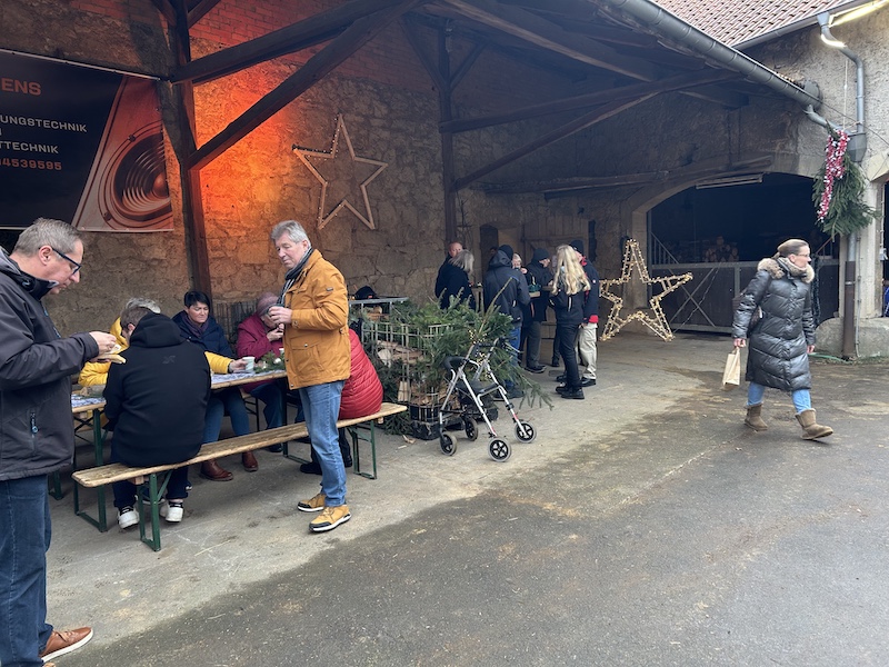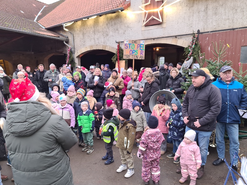 Das kulinarische Angebot traf genau den Geschmack der Besucher. Besonders beliebt war die große Grünkohlpfanne, die ebenso wie Kaffee und Kuchen reißenden Absatz fand. Letzteren hatten die Reiterdamen des Hofes bereitgestellt – am Ende war wirklich jedes Stück Kuchen verkauft. Auch der Hofladen Stichnothe aus Wallensen war mit einem umfangreichen Sortiment an regionalen Spezialitäten und Geschenkartikeln vertreten und wurde von den Gästen sehr gut angenommen. Unerwartet erfolgreich lief zudem der Weihnachtsbaumverkauf, der den Verein positiv überraschte. Für einen besonders herzlichen Moment sorgte der Auftritt von rund 30 Kindern der örtlichen Kindertagesstätte Stoppelhopser, die Weihnachtslieder sangen und damit ihre Wette mit dem Kulturförderverein einlösten. Wie versprochen überreichte der Verein der Kita dafür 250 Euro – ein Geschenk, das nicht nur im Portemonnaie, sondern auch im Herzen ankam.