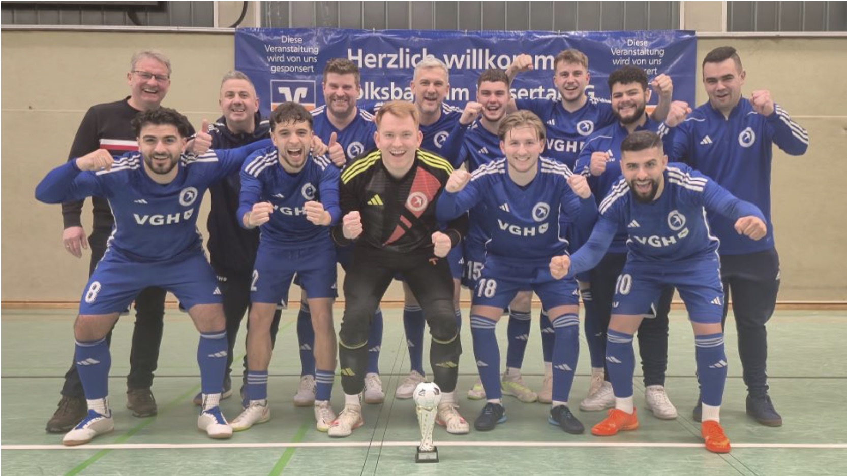 Salzhemmendorf (gök). Die Kreissporthalle Salzhemmendorf stand am vergangenen Wochenende wieder ganz im Zeichen des runden Leders. Bei der zehnten Jubiläumsauflage des Volksbank im Wesertal-Cups, ausgerichtet von Blau-Weiß Hemmendorf/S, wurde teilweise wieder starker Hallenfußball geboten. Am Ende eines intensiven Turniertages setzte sich aber wieder der Favorit durch. Der Landesligist HSC BW Tündern wiederholte seinen Vorjahressieg und sicherte sich erneut die begehrte Trophäe. Im Nachhinein für Schmunzeln sorgte der Umstand, dass der Titelverteidiger den Wanderpokal zuhause vergessen hatte. Durch die Siegwiederholung kann er aber sowieso in der Vitrine stehen bleiben.