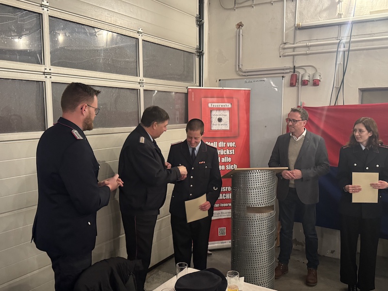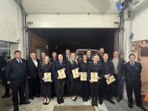 Feierlich war es auch bei den zahlreichen Auszeichnungen. Neben der Beförderung von Gerrit Schwagmeyer zum Oberbrandmeister wurde Sebastian Kutz zum Löschmeister ernannt. Weitere Beförderungen erhielten Lara Fricke und Janine Schmidt (Feuerwehrfrau), Sophie Falk (Oberfeuerwehrfrau), Sören-Maximilian Modler (Oberfeuerwehrmann), Michaela Herrmann und Lara Wahrhausen (Hauptfeuerwehrfrau) sowie Malte-Sebastian Modler (Hauptfeuerwehrmann). Auch wenn die langjährigen Fördermitglieder Edgar Suerland und Karl Ruhland (50 Jahre) sowie Burkhard Cohrs, Marcus Hanke und Friedrich Albrecht (25 Jahre) nicht persönlich anwesend sein konnten, galt ihnen der ausdrückliche Dank für ihre jahrzehntelange Unterstützung.