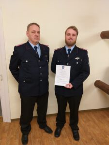 Foto: Ortsbrandmeister Armin Lehnhoff konnte seinen Sohn Armin-Alexander Lehnhoff zum Hauptfeuerwehrmann befördern