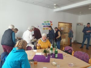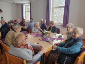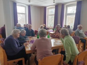 Bereits zur Eröffnung war der Saal im Pfarrhaus mit 40 Personen sehr gut gefüllt. Das Konzept ist so simpel wie effektiv: Menschen zusammenbringen, Barrieren abbauen und in gemütlicher Runde gemeinsam essen. Das Team um Heike Knoke und Gabriela Carnehl hatte alle Hände voll zu tun, um die hungrigen Gäste zu bewirten. Neben der klassischen Käse-Lauch-Suppe wurde eine vegetarische Möhrensuppe serviert, gefolgt von einem süßen Nachtisch aus Pudding und Roter Grütze. Doch die Suppe war eigentlich nur der „Türöffner“. Im Mittelpunkt stand der soziale Austausch. Bei einer abschließenden Tasse Kaffee wurden ausgiebig Neuigkeiten ausgetauscht und alte Bekanntschaften gepflegt. „Das war echt eine schöne Sache. Die letzten Gäste sind erst nach über zwei Stunden gegangen“, resümierte Gabriela Carnehl sichtlich zufrieden.