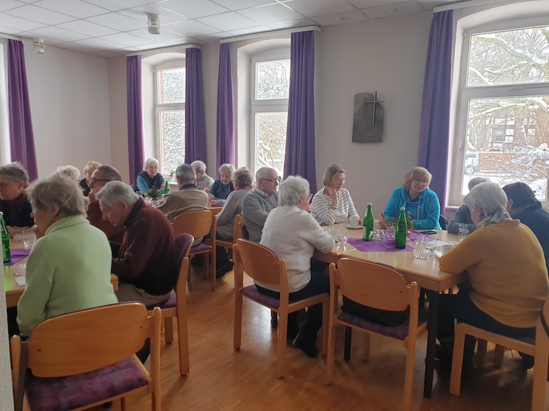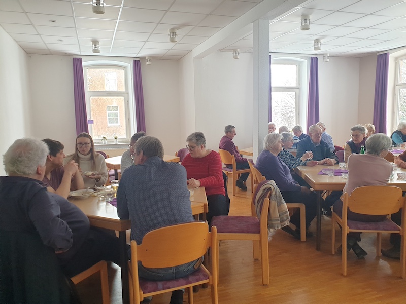 Bereits zur Eröffnung war der Saal im Pfarrhaus mit 40 Personen sehr gut gefüllt. Das Konzept ist so simpel wie effektiv: Menschen zusammenbringen, Barrieren abbauen und in gemütlicher Runde gemeinsam essen. Das Team um Heike Knoke und Gabriela Carnehl hatte alle Hände voll zu tun, um die hungrigen Gäste zu bewirten. Neben der klassischen Käse-Lauch-Suppe wurde eine vegetarische Möhrensuppe serviert, gefolgt von einem süßen Nachtisch aus Pudding und Roter Grütze. Doch die Suppe war eigentlich nur der „Türöffner“. Im Mittelpunkt stand der soziale Austausch. Bei einer abschließenden Tasse Kaffee wurden ausgiebig Neuigkeiten ausgetauscht und alte Bekanntschaften gepflegt. „Das war echt eine schöne Sache. Die letzten Gäste sind erst nach über zwei Stunden gegangen“, resümierte Gabriela Carnehl sichtlich zufrieden.