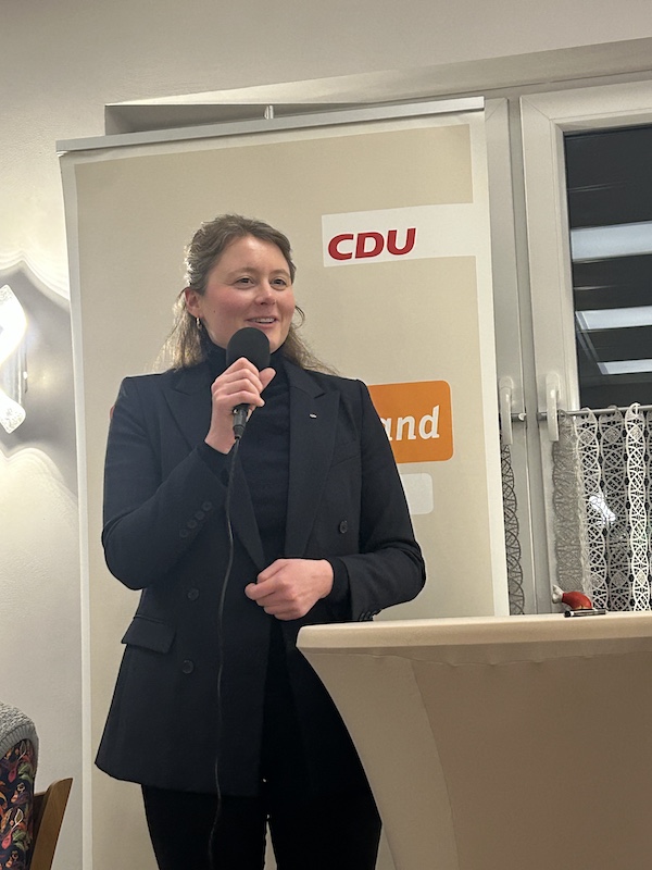 Einen detaillierten Einblick in die Arbeit auf Gemeindeebene gab Michael Lang, Fraktionsvorsitzender der CDU im Rat des Fleckens Salzhemmendorf. Er verwies auf Großprojekte wie den Schulanbau in Salzhemmendorf, das geplante „Feuerwehrgerätehaus Mitte“ und die Überlegungen zum neuen Bauhof. Lang betonte, dass die CDU ihre Oppositionsrolle konstruktiv ausfülle, äußerte jedoch deutliche Warnungen mit Blick auf die Finanzen. Insbesondere die geplante Neuverschuldung von rund vier Millionen Euro im Jahr 2026 sowie die langfristige Finanzplanung bereiten der Fraktion Sorge. Nach dem Essen, das von den Gästen viel Lob erntete, stellte sich Elisabeth Meyer vor. Die 38jährige Betriebswirtin und Eventmanagerin bewirbt sich um das Amt der Landrätin. In ihrer Rede betonte sie die Notwendigkeit einer bürgernahen und serviceorientierten Kreisverwaltung. In der anschließenden lebhaften Diskussion entwickelte sich ein reger Austausch über die zentralen Herausforderungen der Region. Dabei standen Themen wie die Dorf- und Raumplanung, Windkraft- und Energievorhaben sowie die Infrastruktur und Verkehrssicherheit im Mittelpunkt. Meyer nahm sich zudem Zeit, über die Bedeutung des Tourismus und die Förderung des gesellschaftlichen Lebens sowie des Ehrenamts zu sprechen. In den Gesprächen wurde deutlich, dass sich viele Anwesende eine Verwaltung wünschen, die als moderner Dienstleister agiert und die aktuellen Herausforderungen im Landkreis entschlossen anpackt.
