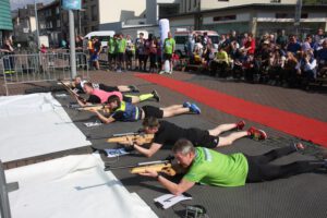 2) Liegendschießen mit 5 Schüssen. Jeder Fehlschuss wird mit einer 50-Meter-Strafrunde auf Skilanglauf-Cardiogeräten (Thoraxtrainern) bestraft.