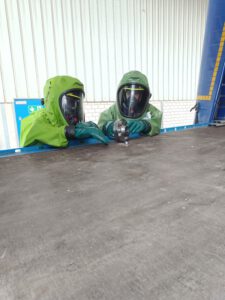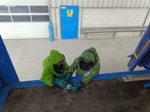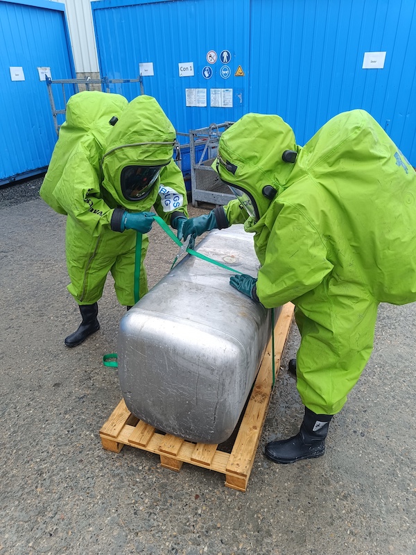An verschiedenen Stationen wurde auf dem Gelände das Handling in einem CSA praxisnah ausgebildet. So mussten zum Beispiel zwei Flanschstücke mit Schrauben und Muttern miteinander verbunden werden. „Normalerweise ist dies kein Problem, aber wenn man mit einem Atemschutzgerät auf dem Rücken in einem Vollschutzanzug diese Arbeiten erledigen muss und dadurch auch die Sicht und vor allem die Bewegung und der Tastsinn eingeschränkt sind, wird dies zur schweißtreibenden Herausforderung“, erklärt Dennis Kleinert, Gefahrgutzugführer des Brandabschnitts West aus dem Landkreis Hildesheim im Gespräch. Weiter ging es für die Teilnehmer mit dem transportieren und heben von schweren Lasten, denn auch an Einsatzstellen muss ein abgesperrter Sicherheitsbereich mit Materialien wie etwa Auffangbehältern, Abdichtmaterial oder Werkzeugen überwunden werden. Zu guter Letzt musste ein havarierter Gasdruckbehälter fachgerecht gesichert werden, bevor dann auch langsam die Luft in den Atemschutzgeräten knapp wurde, da diese bei körperlicher Belastung nur 20 bis 30 Minuten ausreicht.