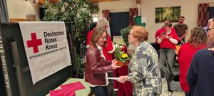 Foto02: Marie-Louise Warnecke erhält für 50 Jahre Mitgliedschaft im DRK eine Ehrenurkunde und einen Blumenkorb.